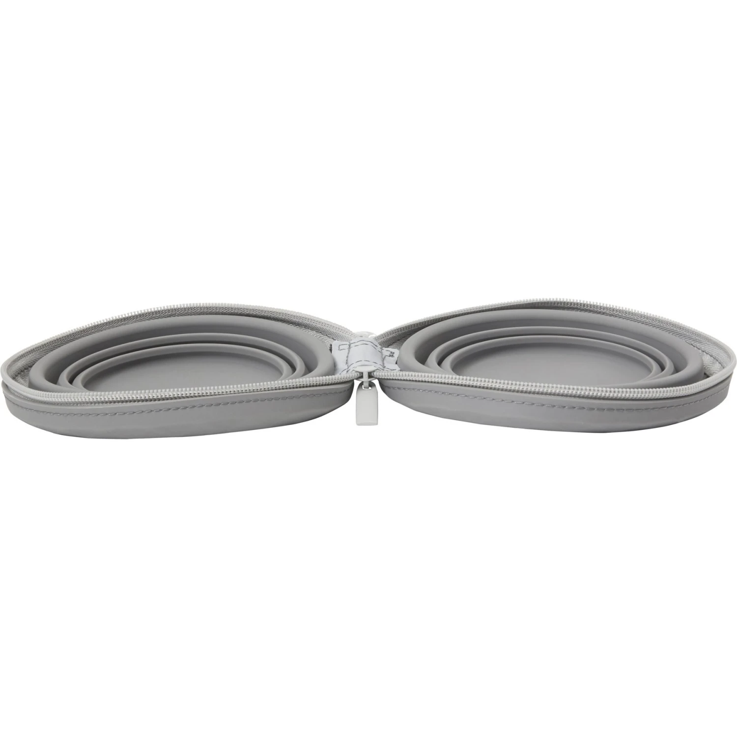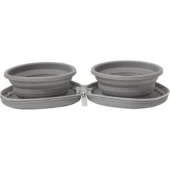 - One set of two collapsible travel bowls that fold up and zipper shut.